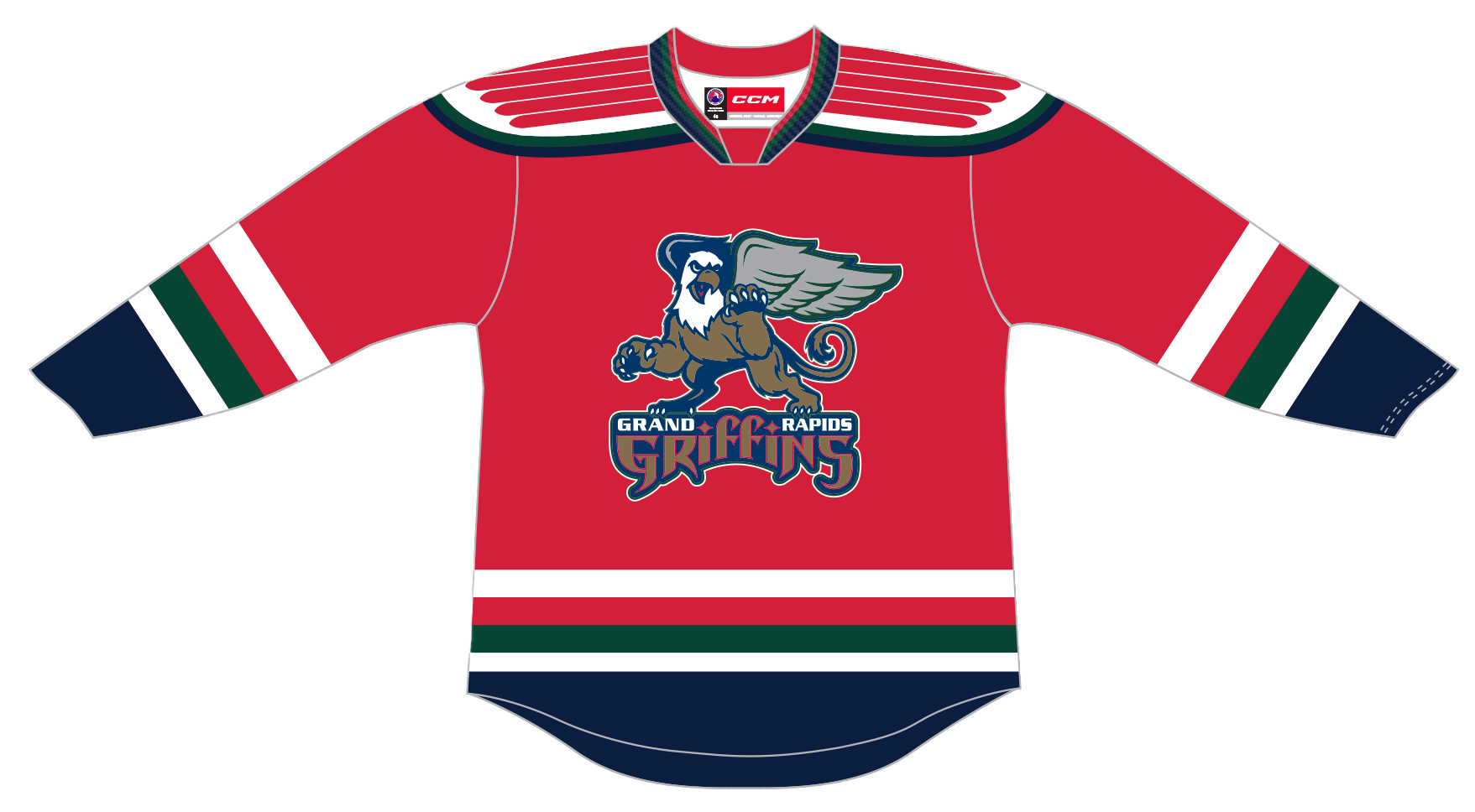 The CCM Quicklite Grand Rapids Griffins Premier Alternate jersey is made of high-quality polyester two-way stretch pique fabric and has solid mesh inserts for ventilation. This officially licensed jersey is engineered to duplicate the on-ice team jersey. The front crest is embroidered just like the authentic jersey and the single layer screen printed tackle twill shoulder patches (where applicable) are applied directly to the jersey.