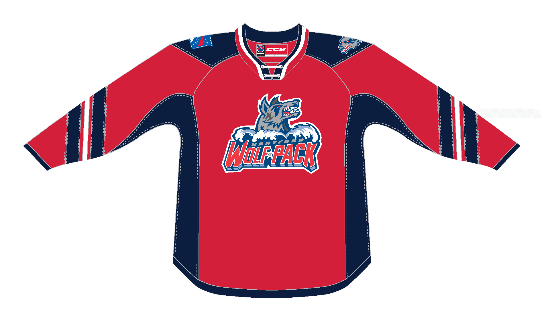The CCM Quicklite Hartford Wolf Pack Premier Alternate Red Jersey is made of high-quality polyester two-way stretch pique fabric and has solid mesh inserts for ventilation. This officially licensed jersey is engineered to duplicate the on-ice team jersey. The front crest is embroidered just like the authentic jersey and the single layer screen printed tackle twill shoulder patches (where applicable) are applied directly to the jersey.