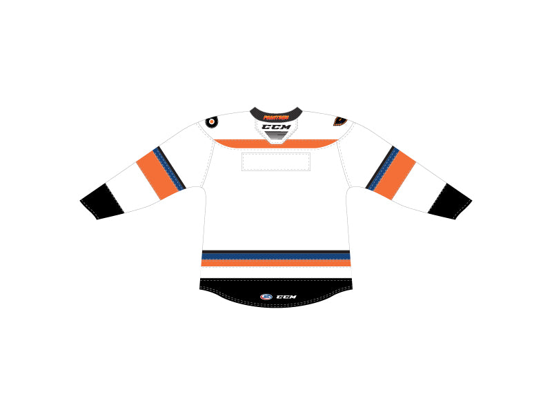 The CCM Quicklite Lehigh Valley Phantoms Premier White Jersey is made of high-quality polyester two-way stretch pique fabric and has solid mesh inserts for ventilation. This officially licensed jersey is engineered to duplicate the on-ice team jersey. The front crest is embroidered just like the authentic jersey and the single layer screen printed tackle twill shoulder patches (where applicable) are applied to the jersey.