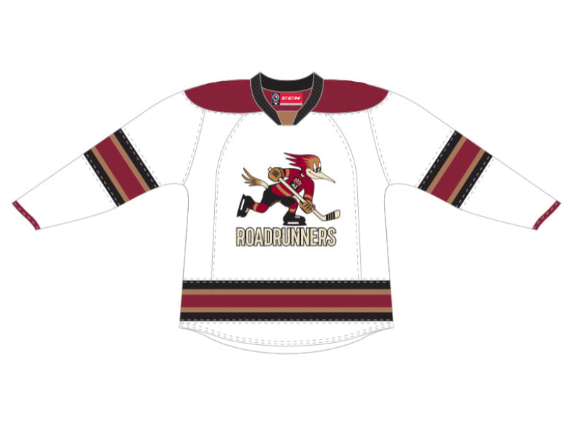 The CCM Quicklite Tucson Roadrunners Premier White jersey is made of high-quality polyester two-way stretch pique fabric and has solid mesh inserts for ventilation. This officially licensed jersey is engineered to duplicate the on-ice team jersey. The front crest is embroidered just like the authentic jersey and the single layer screen printed tackle twill shoulder patches (where applicable) are applied directly to the jersey.