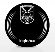 This puck features a graphic on the front with both team logos and the 2024 Calder Cup Playoffs logo on the back. Made by InGlasCo, official puck supplier to the AHL.